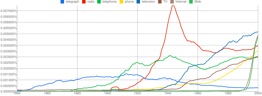 The Books Ngram Viewer from Google Labs provides a fascinating insight into language usage in the past 200 years. An Ngram is a series of one or more items from a sequence, in this case a word or phrase from a published text. Google’s viewer plots the frequency of occurrence for Ngrams found in books published since 1800. It is possible to narrow the search to specific collections of books or corpus. Available corpora include American English, British English, English Fiction etc. Researchers at Harvard University’s Cultural Observatory have put together some tips for using this data and have invented a new word