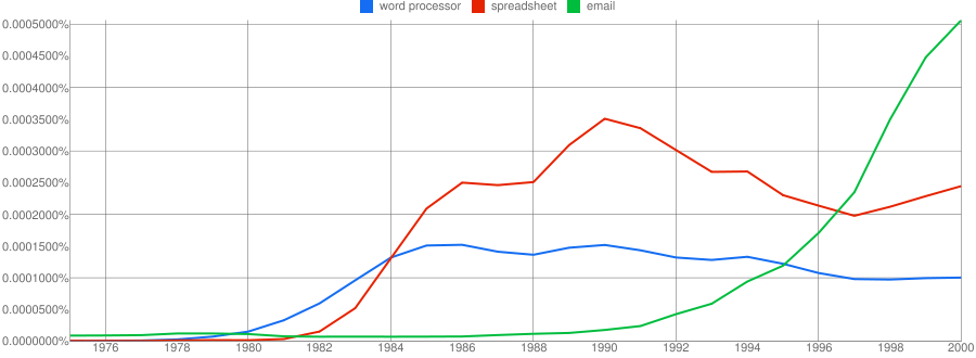 Wherever there is desktop computing there are word processors, spreadsheets and email. Since the introduction of VisiCalc in 1975, through Lotus 1-2-3, and Excel, the spreadsheet has grown in popularity. Word processors like wordstar, wordperfect and Word have have become equally ubiquitous. Both these technologies emerged in the mid seventies but took off with the spread of the personal computer in the 1980s. Email has grown with the rise of the internet. None of curves for these technologies look like a hype cycle.