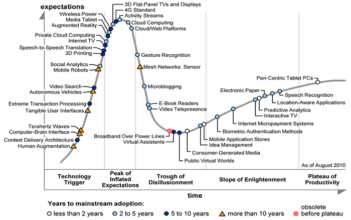 A nice example of the failure of the Hype Cycle is the positioning of Microblogging in August 2010. With the benefit of hindsight it is possible to see this as completely inaccurate. Twitter was just starting to gain “visibility” in August 2010. Within 6 months Twitter had been a cited as a causal factor in overthrowing at least three governments and supporting massive turmoil to the middle east. hardly a technology in the slough of despond!