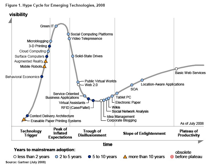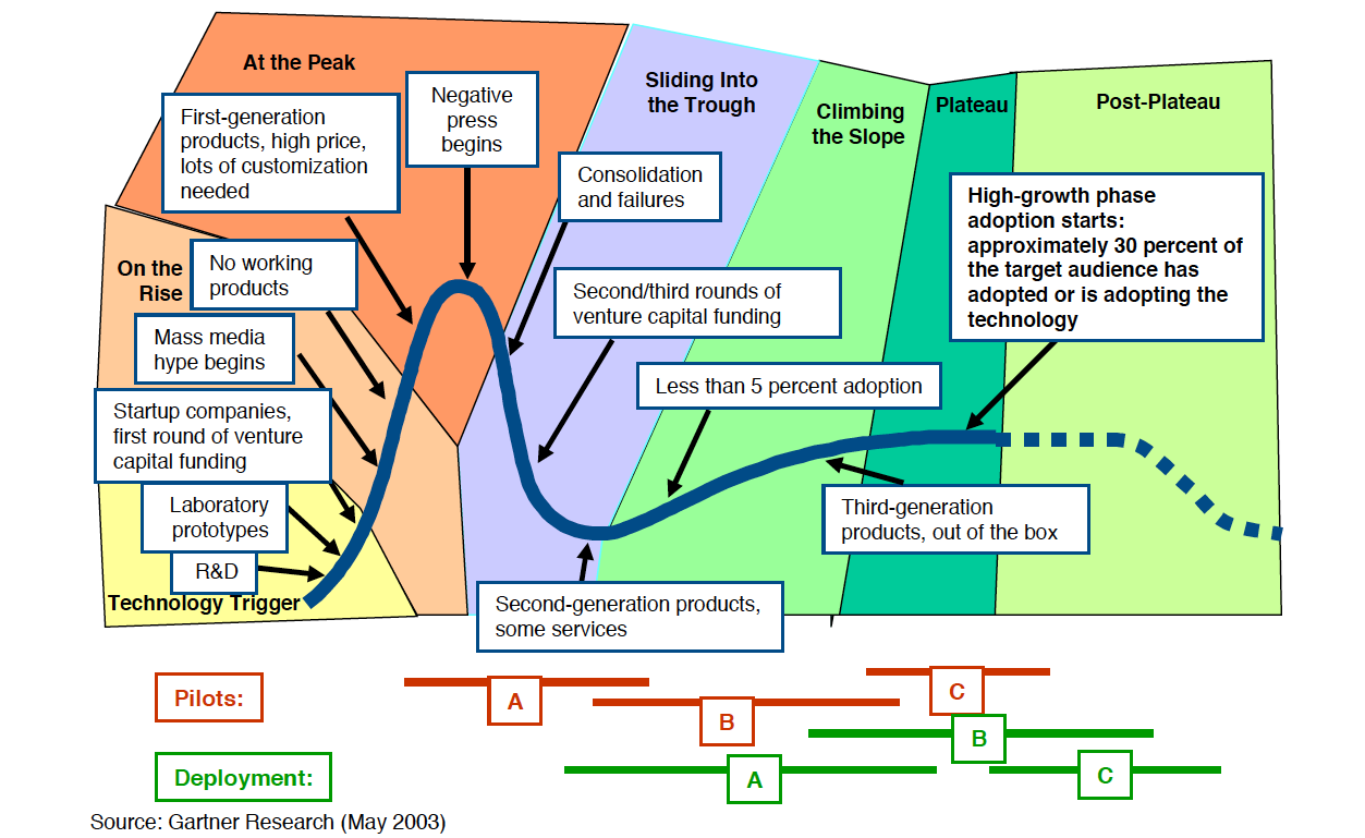 I find the Hype Cycle concept far too smug and subjective – ideal for MBA courses, but not much use in the real world. I can find no objective evidence in support of the claim that visibility or expectations for a technology are highest before it has reached more than 5 % adoption. I can find no evidence that successful technologies go through a visibility “trough” phase. Technologies appear to be positioned on the curve at the whim of Gartners “expert analysts”, and Gartner admit that different analysts will position the same technology in different places on different curves. Given all these admissions of subjectivity It amazes me that people are willing to pay for this nonsense.