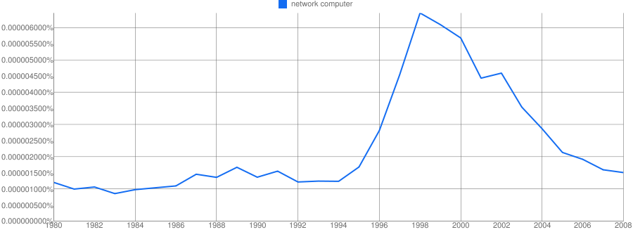 But what about failed tehcnologies? Technologies that were hyped but never made it. The technologies that Gartners analysts could save you from if only you’d listen to their sage advice. The Network Computer was a concept marketed by Oracle and Sun Microsystems in the mid 1990s. The concept defined a cheap diskless networked personal computer that downloaded its applications from the internet and stored it’s working files on internet servers. A sort of physical thin client. The interesting thing about network computers from my perspective is how long it took for the idea to die. Gartner suggest that visibility decays as fast as it grows but it clearly did not for the network computer.