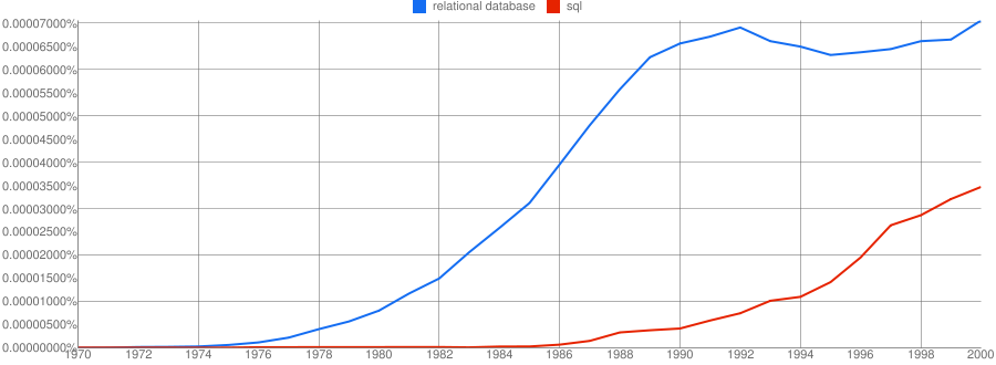 Relational database technology was first defined by Codd and Date in the late 1960’s and early 1970’s. It was commercialized in the late 1970’s by SDL which later became Oracle. The relational approach to data management became the industry standard and enabled Oracle to become one of the largest companies in Silicon Valley. As the graph below clearly shows; there was no “peak of inflated expectations” or “trough of disillusionment”. Relational databases took off and didn’t slow down for nearly 2 decades! I believe the flattening in the 1990s was probably due to their success. By the 1990s the qualifier “Relational” was no longer necessary – only non-relational databases needed a qualifier! Relational databases had become ubiquitous and banal, they were just databases.