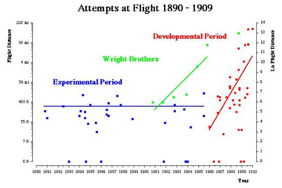 The Figure above depicts the longest flights made by various aircraft in the period 1890 to 1909. Green points represent the various Wright craft during this period. Blue points represent non-Wright craft made between 1890 and 1905, while red points represent non-Wright craft made from 1906 to 1909. Lines on the graph are regression functions. The flat blue line indicates that the field as a whole was making NO sustained progress through the end of 1905. This lack of progress is almost invariably true of individual inventors as well as the group as a whole. The positive slope of the Wright brothers indicates a steady progression in the ability of their heavier-than-air craft. Once details of the Wrights methods became public when their patent was issued in late 1905, other inventors quickly copied the important discoveries of the Wright brothers, and developed airplanes as capable as those of the Wrights.