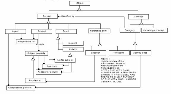 Definition of the NHS Data Model was started in 1986 and continued for several years. It was eventually renamed the Common Basic Specification (CBS). By 1992 a CBS Generic Model had been published. This was in effect a top level ontology (similar to the SUMO currently under development). It was developed for healthcare service delivery but it as can be seen from the diagram below it was universally applicable to any kind of service delivery.
