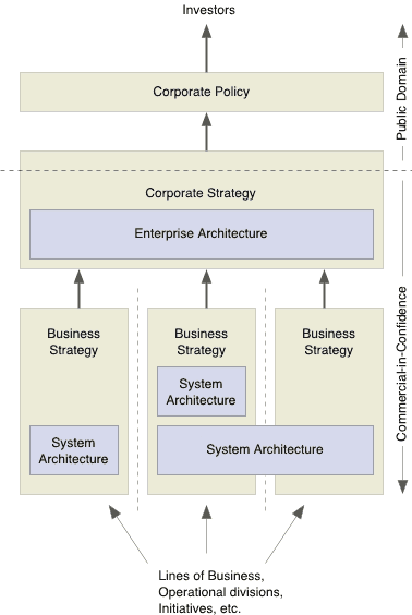 Understanding how a System Architecture supports it’s Business Strategy within the framework of an Enterprise Architecture and how these in turn support Corporate Strategy and ultimately Corporate Policy is essential if systems are to deliver business value. This is not easy and is one reason why so many systems fail to deliver business value. The difficulty stems form the ever-changing business environment that forces continuous changes in goals and objectives. Making the goals and objectives explicit and then tracking them as they change is the only way to keep up with the game. But that is the topic for another time.